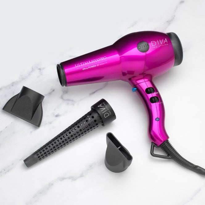 Diva Ultima 5000 Pro Stylists Hairdryer, a powerful 2000w professional hairdryer with an airflow of 110°C 110m3/hour making it capable of drying hair with exceptional speed, finished in soft touch black, with 2 speed settings and 4 heat settings, plus a cold shot button and 3 metre long salon swivel cord. Ceramic and Tourmaline front grille and with removable rear grille for easy cleaning, Ionic conditioning 5,000,000 ions/cm3, comes with two slim precision styling heat concentrators. Available in Black, Pink, Red or Purple.